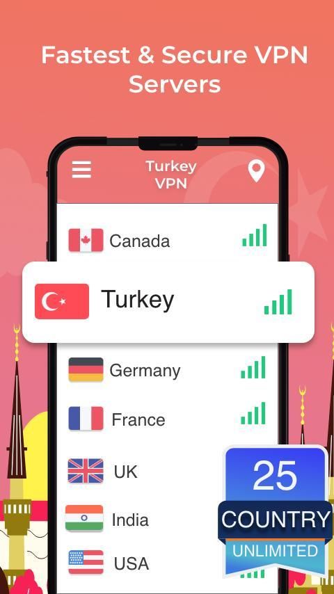 Turkey VPN is 100% free and unlimited VPN Proxy! You will get access to unlimited VPN proxy service for FREE. The best unlimited Free VPN proxy client for android. With Turkey VPN you can unblock sites, WiFi hotspots, firewalls etc.. Turkey VPN is secure and leak proof to protect your privacy. No matter if you are looking for security on public WiFi Hotspot , you can get it all with Turkey VPN.