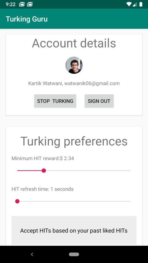 This application helps in managing the Turking Guru chrome extension app from your mobile phone. This application also sends you a notification when a new HIT is accepted.