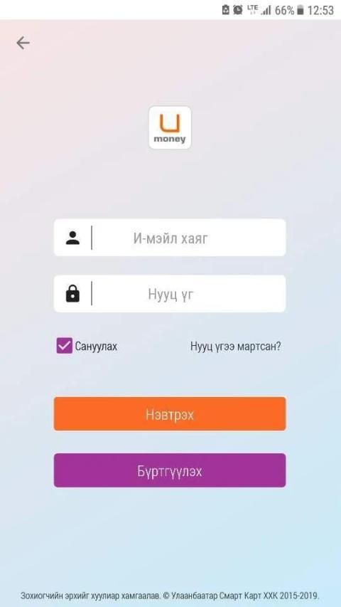 Pengguna yang memiliki daftar di www.u-money.mn dapat masuk langsung dengan informasi yang terdaftar dan jika tidak mendaftar, Anda dapat mendaftar melalui aplikasi ini.