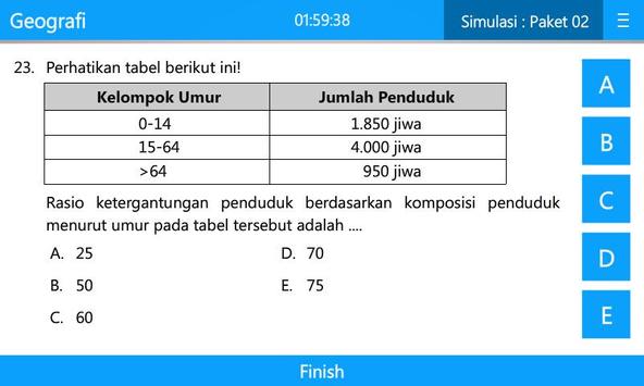 Aplikasi Simulasi UN & USBN Berbasis Komputer Geografi SMA/MA. Memuat 2 paket simulasi UN & 2 paket simulasi USBN.