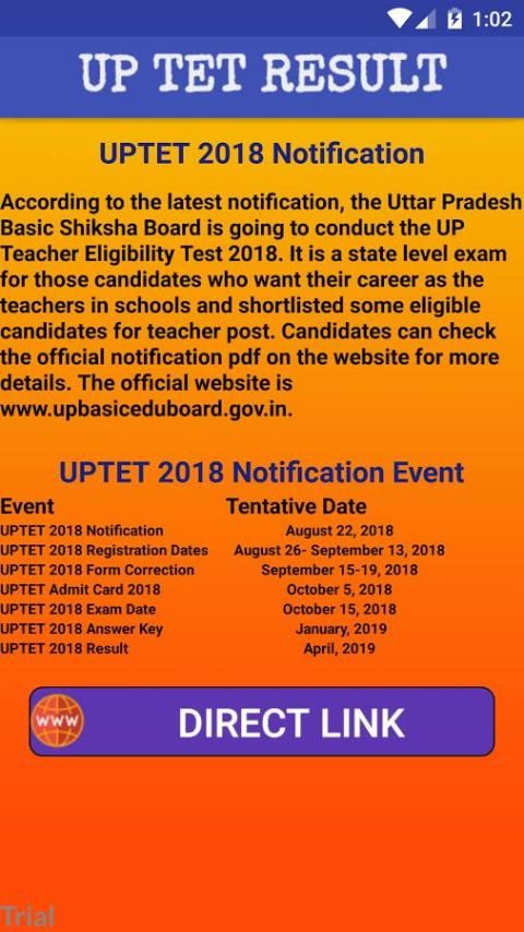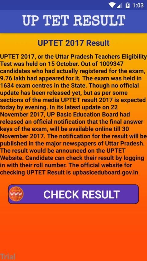Halo Semua, Selamat Datang di UPTET 2017 Hasil App. Dalam Aplikasi ini Anda akan menemukan semua informasi terbaru Tentang Hasil UPTET, UPTET 2018 Pemberitahuan, Formulir Aplikasi, Akui Card, Kunci Jawaban, cutoff Marks dan Daftar Merit. Ini adalah aplikasi ponsel UPTET Hasil pertama bagi instan mencari UPTET 2017 Hasil sehingga UPTET 2017 Presiden bisa mendapatkan Marks mereka dan UPTET Daftar Merit dengan Kategori bijaksana Daftar tanda cutoff.