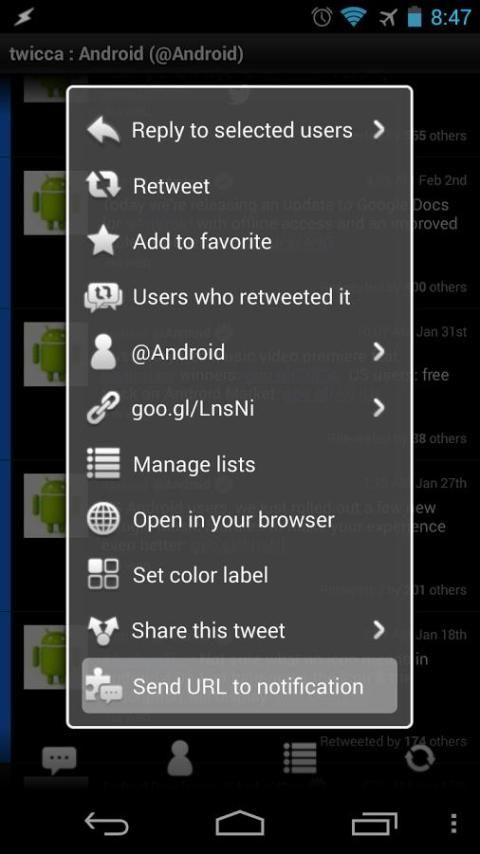 Aplikasi ini mampu bekerja sebagai plug-in untuk twicca (Twitter client). Dalam situasi yang Anda baca timeline Anda, Anda dapat mengirim URL di tweet ke panel notifikasi dengan cepat dan membuka URL setelah selesai waktu membaca.