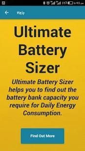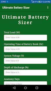 The Ultimate Baterai Sizer membantu dalam memperkirakan kapasitas bank baterai untuk beban tertentu. Aplikasi ini menghitung jumlah yang diperlukan baterai / sel bersama dengan jumlah baterai untuk dihubungkan secara seri & susunan paralel untuk membuat bank baterai. Perhitungan ini dapat digunakan untuk UPS, PV Solar System atau Sistem Energi Angin. Aplikasi Pengguna Interferensi sederhana dan dirancang untuk memudahkan masyarakat umum dalam menentukan kebutuhan mereka sekarang bank baterai.