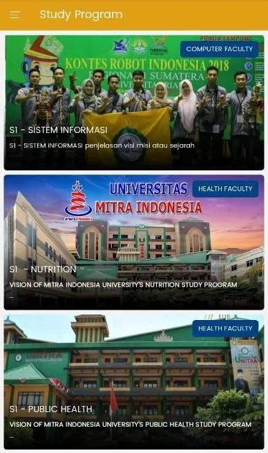 information about the program studies in Mitra Indonesia University, galleries to upload student's extra and intra curricular activity, and form of tracer study to gather information from students, alumni, and stakeholder. The features in Umitra Mobile V.2 are made to ease your time studying in Mitra Indonesia University.