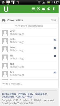 UnSeen It adalah sebuah jejaring sosial, yang membantu anda untuk dapat meluapkan segala perasaan anda tanpa takut sedikitpun: karena semua post atau chat serta komentar di aplikasi ini terpublish secara Anonymous. Walaupun kalian dapat memiliki halaman profil kalian masing masing, tetapi hanya kalianlah yang dapat melihat postingan milik kalian. Kalian pun dapat me-like postingan tersebut jikalau kalian memiliki kesamaan pikiran dengannya. Kalian juga bisa berkomunikasi dengan author setiap postingan / setiap komentar dengan cara klik "chat author" atau klik foto author tersebut.