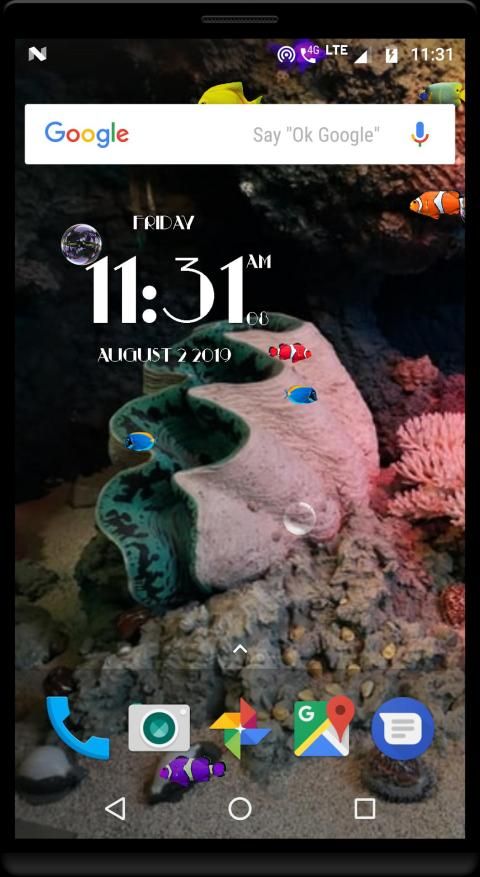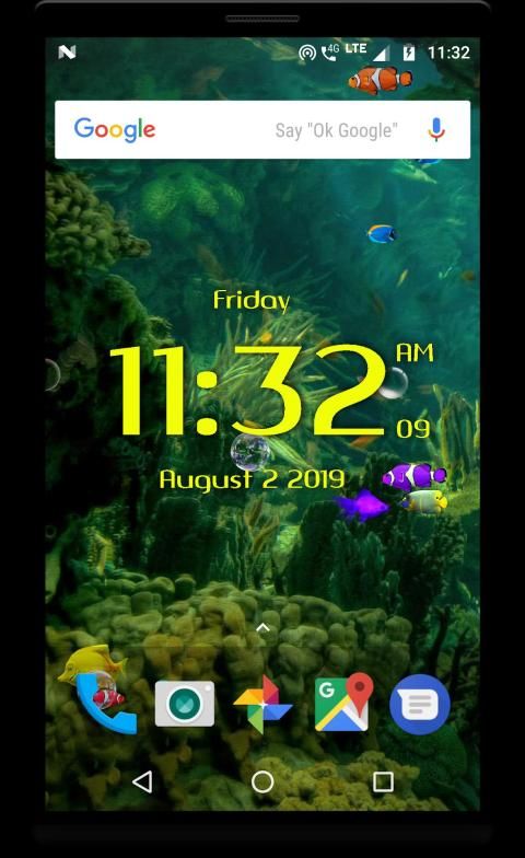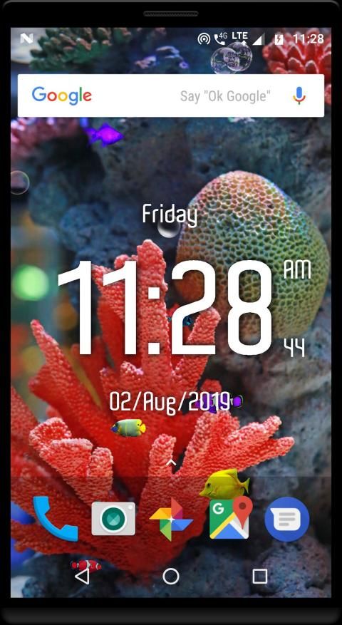 Decorate your screen with moving colorful fishes, real underwater nature background and live digital clock wallpaper.