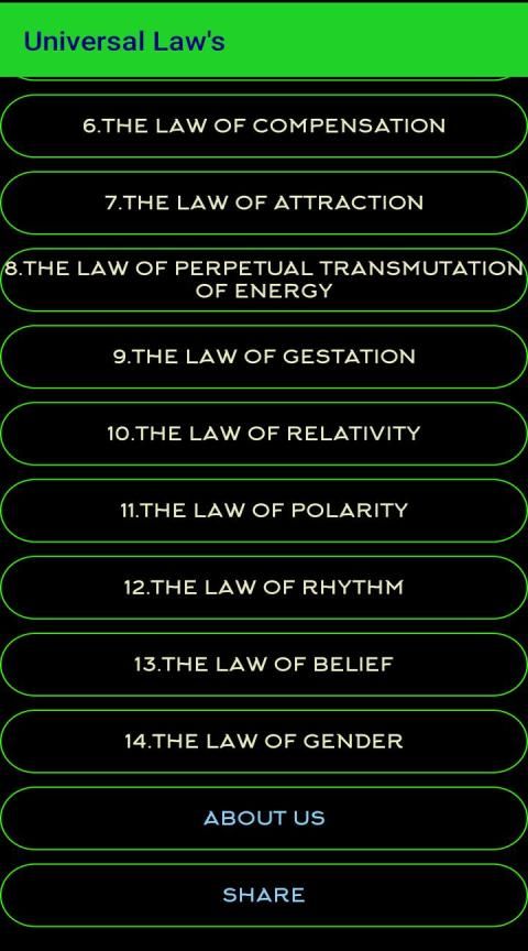 Alam semesta diatur oleh banyak hukum universal yang berbeda seperti Hukum Ketertarikan, Hukum Getaran, Hukum Sebab Akibat, Hukum Relativitas, Hukum Polaritas, Hukum Transmutasi Abadi, Hukum Irama, Hukum Pengorbanan dan banyak lagi. Ada Kekuatan Universal, yang hadir di seluruh alam semesta dan memanifestasikan dirinya melalui itu. Kekuatan ini cerdas dan secara sadar mengelola kosmos dan mempertahankannya dalam harmoni abadi dengan bantuan hukum universal.