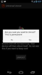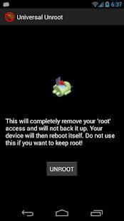 Ini adalah aplikasi yang besar bagi mereka yang berusaha untuk menyelesaikan pengembalian garansi dengan operator untuk hardware perangkat yang rusak atau perbaikan. Jika Anda hanya ingin untuk sementara kehilangan Root Access, aplikasi ini bukan untuk Anda. UnRooting adalah permanen dan tidak dapat dibatalkan dengan aplikasi ini. Hanya menggunakan ini jika Anda benar-benar ingin kehilangan Akses Root.