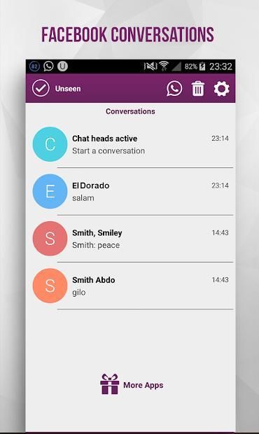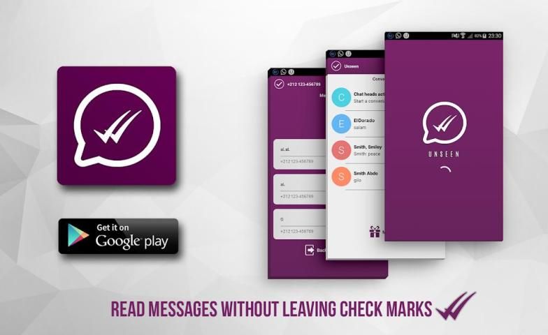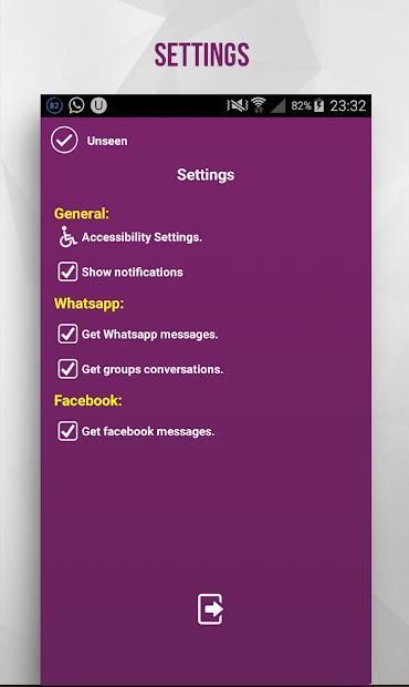 Tak terlihat memungkinkan untuk membaca kedua Whatsapp dan Facebook pesan anonim tanpa orang lain mengetahui tentang hal itu dan itu tidak akan ditandai sebagai dibaca dari perspektif orang lain. Ini mem-parsing pesan dari kelompok dan percakapan individu dari yang paling dikenal aplikasi chat dan menunjukkan kepada mereka untuk Anda. Hal ini juga memberikan kemungkinan untuk melihat foto dan video yang dikirim oleh orang lain.