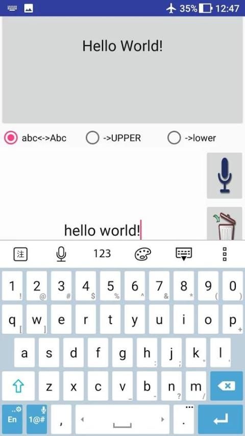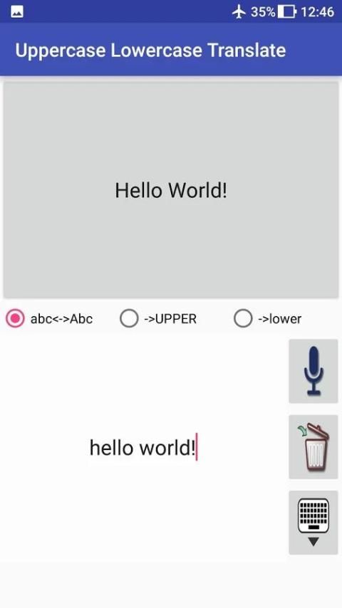 Gunakan aplikasi ini, Anda dapat mentransfer string untuk huruf besar atau huruf kecil. (Semua karakter untuk Huruf Besar / Kecil / Huruf Besar di awal) Dan Anda bahkan bisa mengatakan kalimat untuk mentransfer.