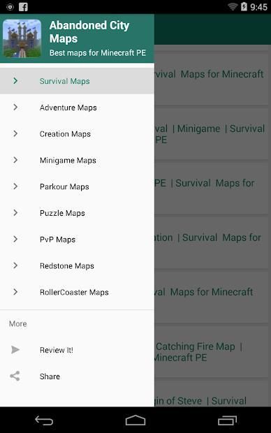 With Abandoned City Maps you can browse over 1000 awesome Minecraft PE maps, include abandoned city, Survival maps, Adventure maps, Creation maps, Puzzle maps, Parkour maps, Mini game maps and others!