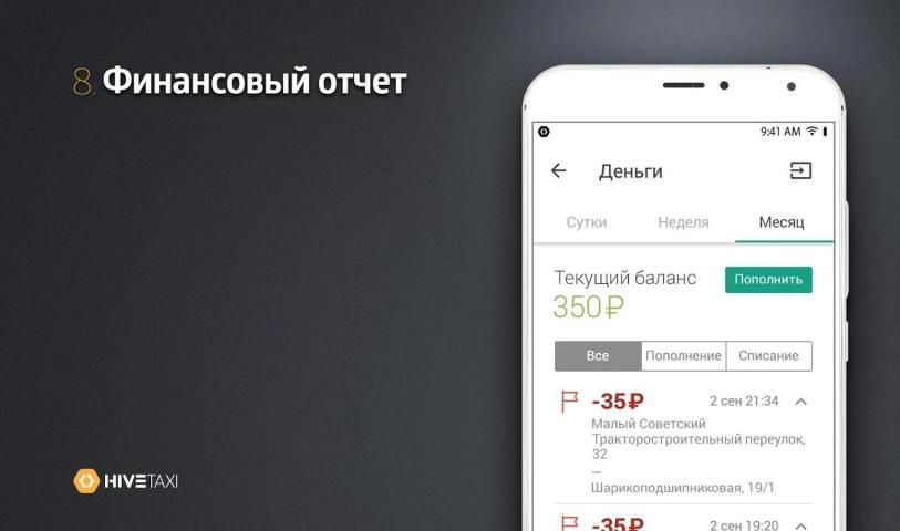 - Menerima informasi yang diperlukan tentang semua perintah yang tersedia pada tahap seleksi: jarak ke alamat pick-up, rute, tingkat, nilai pesanan dan nilai agar pengemudi;