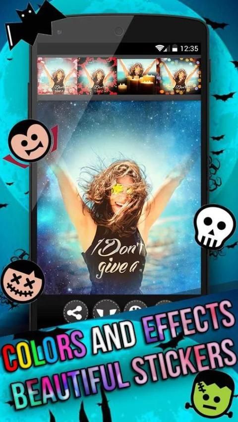 Cukup pilih foto dari galeri atau kamera atau bahkan selfie dan menerapkan tanduk jahat, gigi vampir dan banyak lagi,