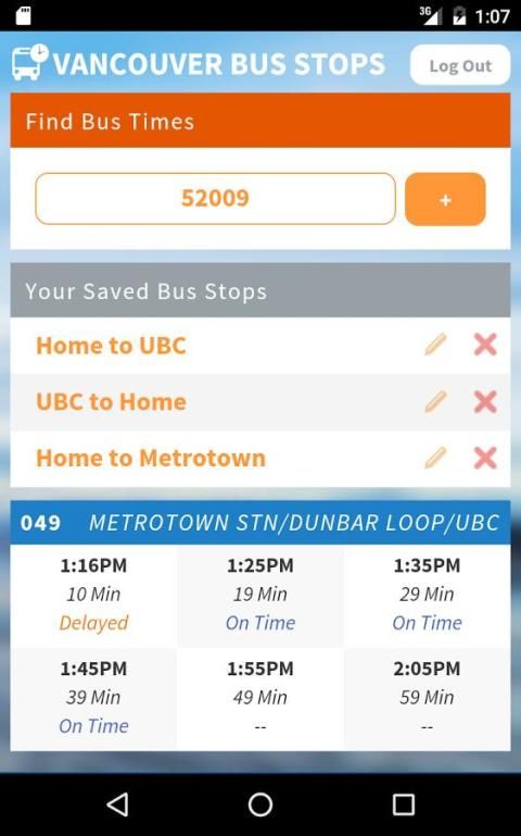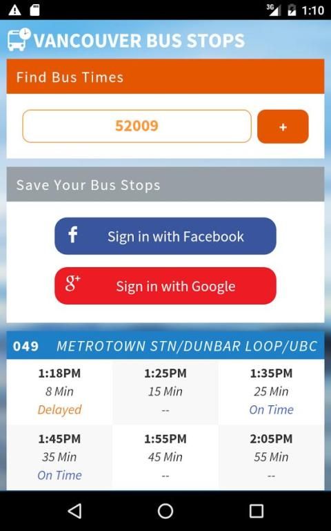 Lelah terus SMS 33.333 untuk Translink untuk mengetahui kapan bus Anda datang? Cari diperkirakan halte bus kali Anda dengan mudah dengan Vancouver Bus Stop! Anda dapat login dengan Facebook atau Google + dan menyimpan nomor halte bus sehingga Anda dapat mengambil kali dengan hanya satu klik pada saat Anda ingin mengetahui ketika bus datang. Selain itu, Anda dapat mempersonalisasi nama halte bus sesuai dengan preferensi Anda sehingga mereka tidak hanya daftar nomor. Anda juga dapat mengunjungi http://vbsapp.com dan semua disimpan bus berhenti Anda akan disinkronkan di semua perangkat.