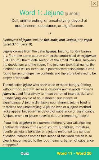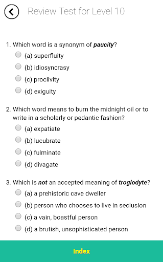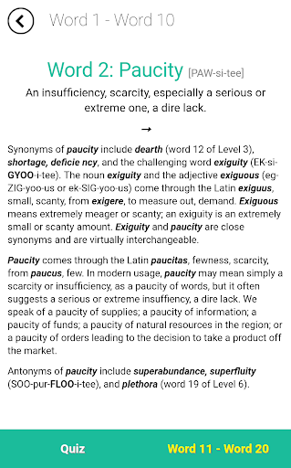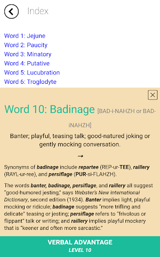 Anda akan melanjutkan melalui sepuluh tingkat kosakata, setiap tingkat lebih menantang daripada yang terakhir. Misalnya, Tingkat 1 berisi kata-kata yang akrab bagi sekitar 60 hingga 70 persen orang dewasa — yaitu, kata-kata yang dikenal banyak lulusan sekolah menengah dan sebagian besar lulusan perguruan tinggi. Pada akhir Level 5 Anda akan meningkatkan kosakata Anda menjadi sekitar persentil ke-75 — seperempat teratas dari semua orang dewasa yang berpendidikan. Pada akhir Level 8 kosakata Anda akan melampaui kebanyakan eksekutif dan profesional, termasuk mereka yang memiliki gelar lanjutan. Dan ketika Anda menyelesaikan tingkat kesepuluh dan tingkat terakhir, Anda akan maju melampaui 95 persen dari seluruh populasi. Anda akan memerintahkan gudang senjata kata-kata yang hanya dapat ditandingi oleh segelintir orang di setiap seribu.