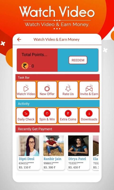- watch video and earn money User can earn free earn money by completing offers and task. User will get points after each task completion.