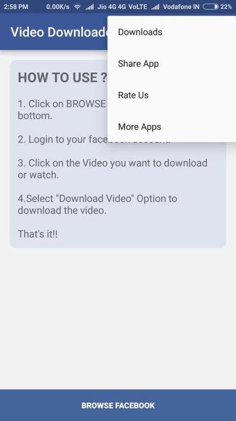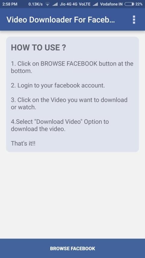 Video Downloader untuk Facebook memungkinkan Anda untuk memilih video yang ingin Anda download dan menyimpannya sehingga Anda dapat melihatnya nanti dan berbagi dengan teman-teman Anda melalui aplikasi yang berbeda.