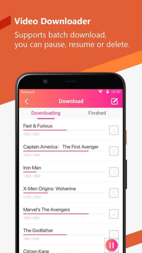 Video downloader manager: Supports batch download, you can pause, resume or delete.
