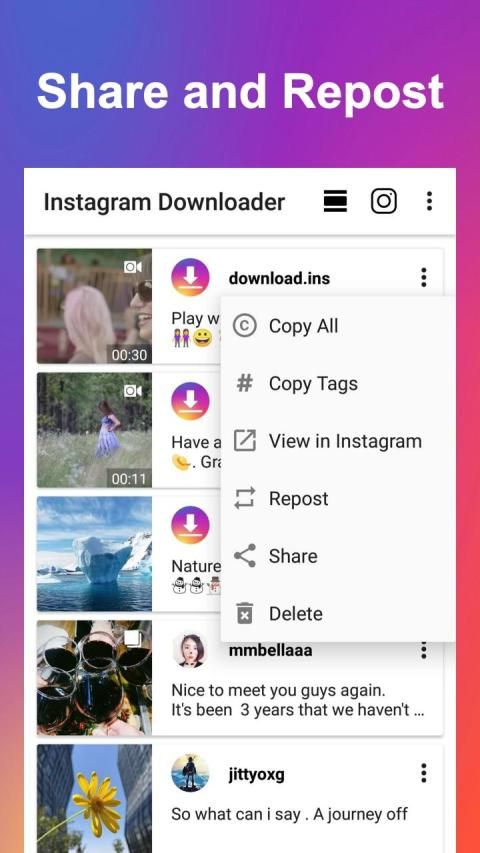 - Mendukung tautan salin, berbagi, mengganti nama, memposting ulang untuk foto atau video yang diunduh