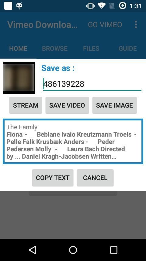 Vimeo Downloader dan menunggu pemuatan dari aplikasi saya, ketika loading selesai Anda dapat menyimpan video langsung dan juga Anda dapat berbagi ke teman Anda. Itu dia!