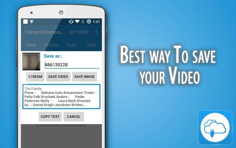 vimeo Video downloader adalah aplikasi yang membantu pengguna untuk menyimpan video dari Vimeo sebagai format MP4 untuk penyimpanan telepon, dan kemampuan untuk menyalin deskripsi video.
