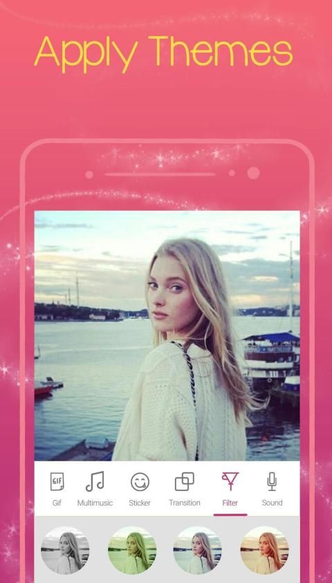 With several steps, selecting photos, adding filters, text and music, instantly finish your own video.