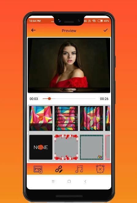 :) Bingkai dan tayangan slide waktu: Banyak bingkai yang indah dan bervariasi agar video Anda menjadi unik. Anda juga dapat mengedit kecepatan video dengan cepat atau lambat dengan memilih durasi pertunjukan slide.