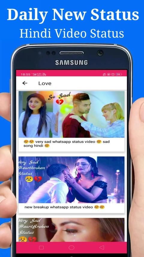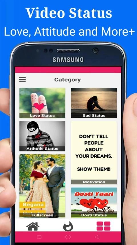 Antarmuka yang sangat mudah digunakan, cukup pilih kategori untuk menonton status video baru hindi 2019 dari koleksi luas Status Video Cinta, Status Video Sedih, Status Video Sikap, Status Video Motivasi, Status Video Layar Penuh, dan Status Video Dosti.
