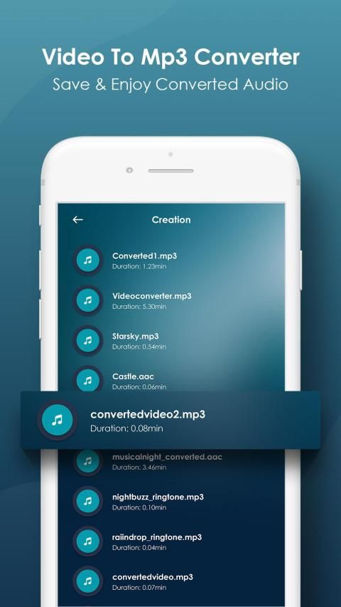. convert all kind of video file into mp3. Using Video to MP3 you can easily extract audio from any video you have. You can convert video files to audio files (MP3, AAC) with various options (size, bitrate, meta data) You can extract the audio and save to the folder of your android device.