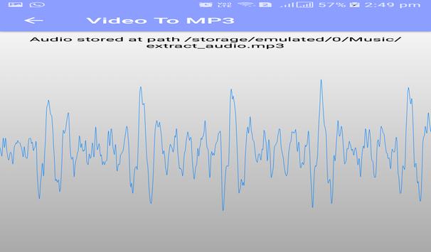 Easily extract audio from your video files . Extract high quality mp3 songs using this powerful application . Make ringtone from your favorite song using mp3 cutter . Video to MP3 Converter uses ffmpeg and libmp3lame as library .