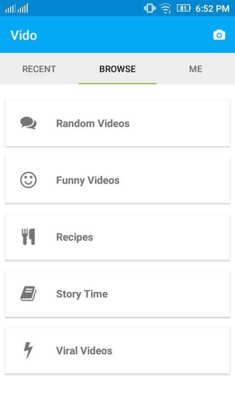 Vido adalah media sosial video untuk pengguna android. Anda dapat meng-upload video Anda sendiri dengan login dengan facebook. Menggunakan di-aplikasi kamera video, Anda dapat membuat video pendek dan mengirimkannya ke server kami, membuat mereka langsung tersedia untuk semua orang.