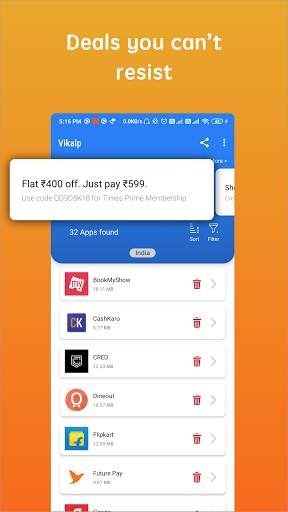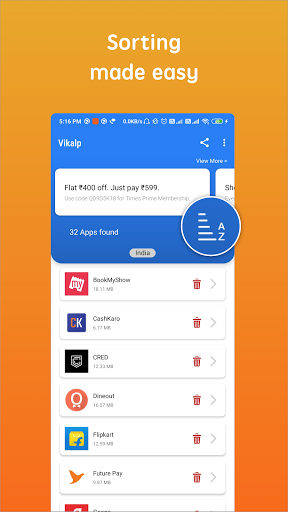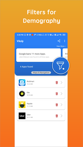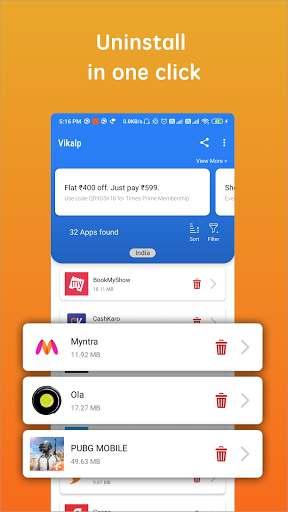 Vikalp adalah alat untuk menghapus instalasi aplikasi di ponsel Android Anda. Ini membantu membebaskan lebih banyak ruang dengan menghapus aplikasi yang tidak perlu. Klik pada Ikon Hapus di sebelah nama aplikasi untuk menghapus instalannya. Mudah dan sederhana!