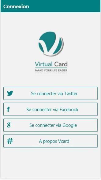 Kartu Virtual adalah aplikasi mobile yang memungkinkan Anda untuk membuat kartu tur profesional dan sesuai dengan standar dari cara yang sangat sederhana dalam menit dan gratis, yang memungkinkan pengguna lain dari aplikasi untuk menemukan semua informasi kontak Anda dan alamat dan lokasi akan ditampilkan secara jelas di VcardMap peta. Kartu Virtual tersedia dalam bahasa Inggris dan Perancis versi bahasa dan konfigurasi dilakukan secara otomatis sesuai dengan konfigurasi ponsel pintar Anda.