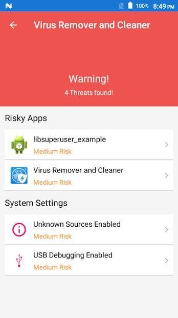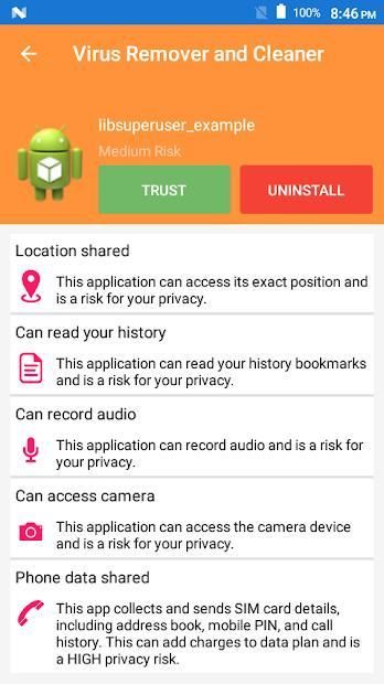 Aplikasi ini akan secara otomatis mendeteksi izin berbahaya dan file yang berada di perangkat mobile Anda dan akan menunjukkan kepada Anda bahwa Anda dapat menghapus dengan Menghapus aplikasi dan menghapus file.