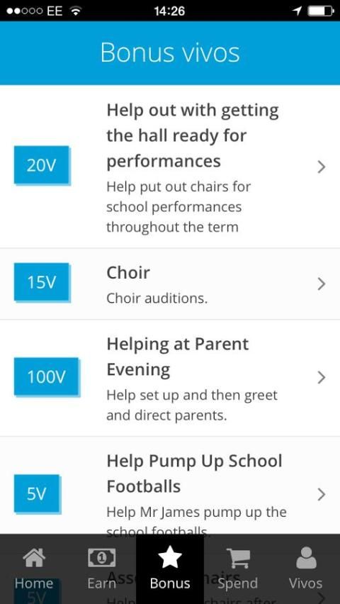Siswa mendapatkan poin yang disebut "Vivos" untuk prestasi dan upaya di sekolah mereka dapat menebus pada manfaat pilihan mereka termasuk peralatan olahraga, ponsel top-up dan tiket Prom mereka.