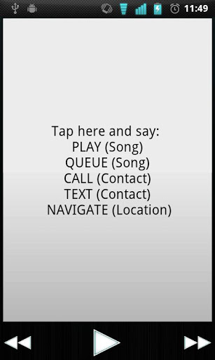 voice Action music player allows you to control your music with your voiceV.A.M.P. Voice Action Music Player Allows you to play and control your music with your voice. Just press the big on screen button and say the command. This is a very minimalistic user interface.Commands include:Play songalbum by artistPlay songalbumartistQueue songalbum by artistQueue songalbumartistvolume UpVolume DownNextPauseStop