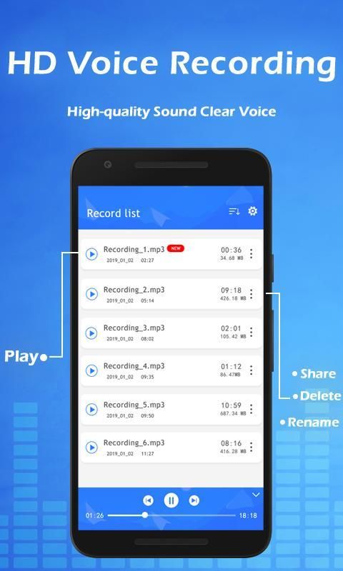 Voice Recorder helps you manage your recording files on a list screen with many options: sort by name/size/date/duration, edit name, playback, delete and share.