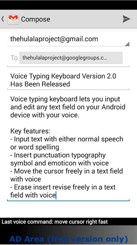 Voice Typing Keyboard (VTK) memungkinkan Anda masukan dan mengedit text field pada perangkat Android Anda dengan suara Anda. Tidak ada tombol mikrofon untuk mendorong, hanya mengatakan "Dengarkan" dan mulai berbicara apa yang ingin Anda masukan dalam kolom teks.