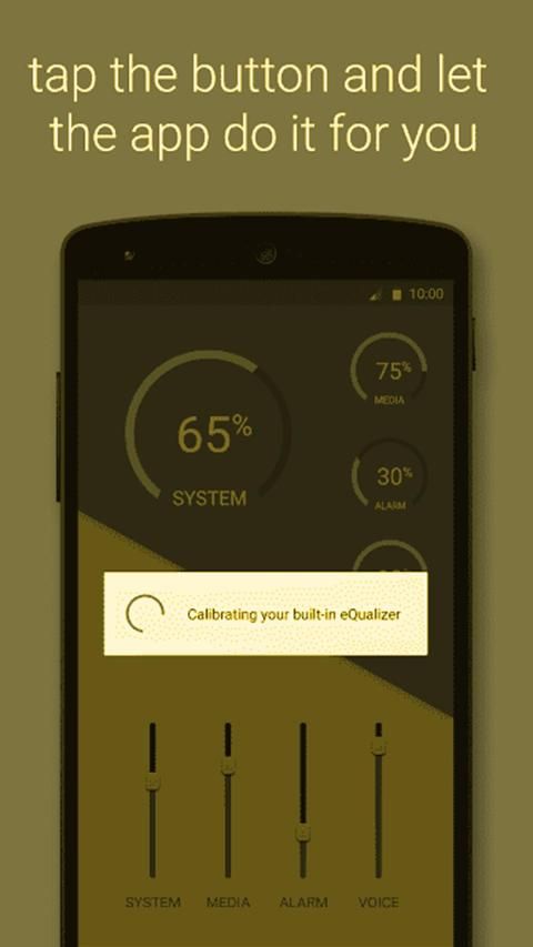 Biarkan Volume - Booster Equalizer mengkalibrasi eQualizer bawaan Anda. Cukup ketuk tombol dan nikmati hasil yang lebih baik hanya dengan satu klik.