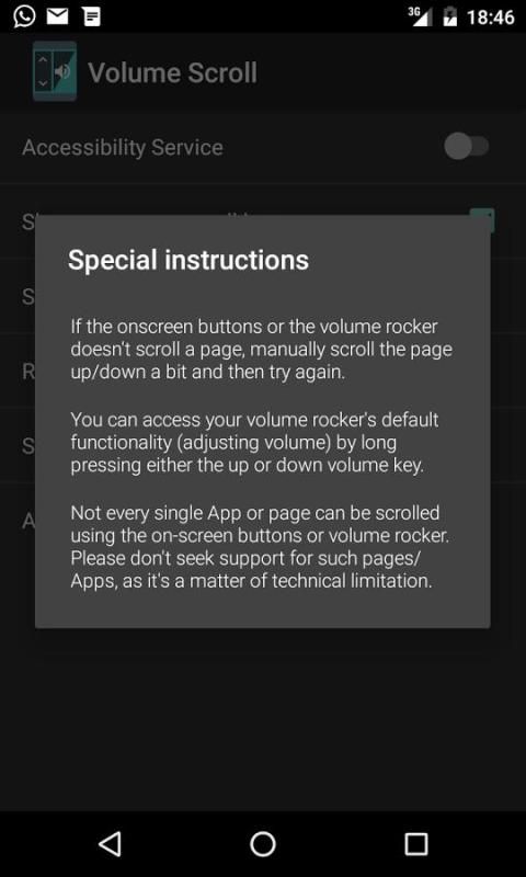 Catatan: The App menggunakan izin Aksesibilitas - yang merupakan syarat mutlak untuk menghubungkan magis antara Rocker Volume dan bergulir. Jika Anda tidak merasa nyaman dengan izin jangan menggunakan App. Yang sedang berkata, saya memiliki beberapa Apps lainnya dikembangkan yang di-download dan dipercaya oleh beberapa pengguna 100.000 (titik dalam kasus - Energy Bar)., Tak satu pun dari Apps memiliki motif tersembunyi