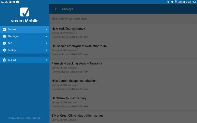 Voxco Ponsel Offline untuk Android dirancang untuk smartphone dan tablet yang menjalankan Android Kitkat OS atau yang lebih baru.