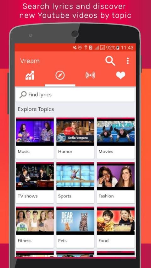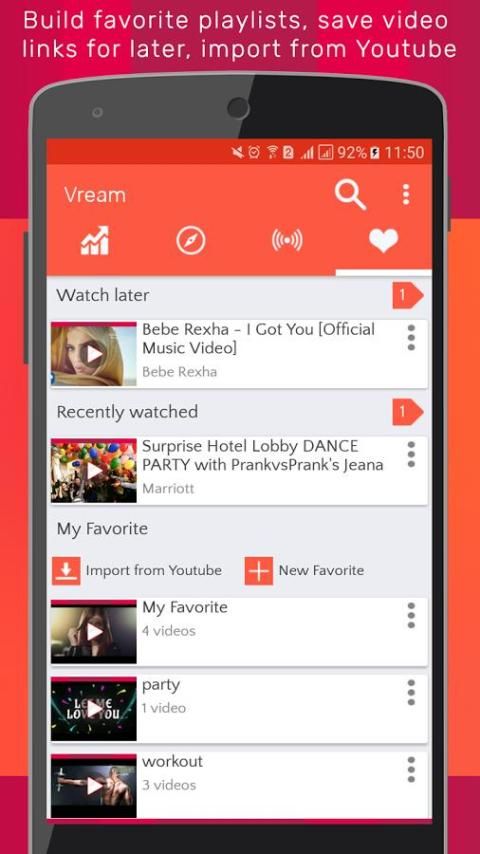 Dengan Vream tidak perlu men-download video, akses mudah ke jutaan video musik Youtube untuk setiap selera, dari rap rock dan dari Bruce Springsteen untuk Justin Bieber. Vream pemain stream semua video favorit Anda secara gratis.