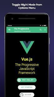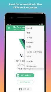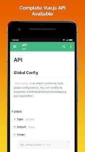 This app contains Vue.js Official Documentation which includes Vue.js Guide, API, Style Guide, Examples, and Cookbook. Documentation is available offline which means you can read the documentation without any internet connection. Documentation is available in five languages: English, Chinese, Japanese, Russian and Korean.