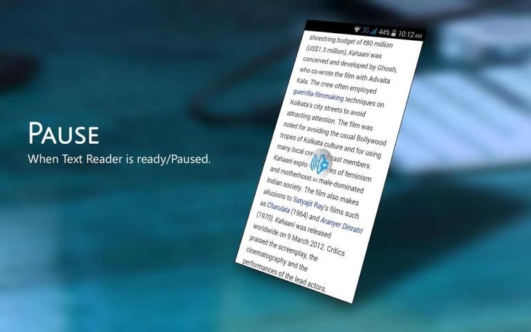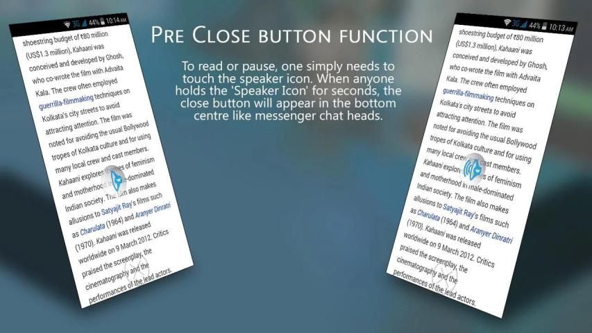 => Pindahkan pop up tombol seperti Facebook chat kepala. Tempatkan tombol mana pun Anda suka dan mulai membaca teks dengan menekan ke atasnya. Tarik mana saja ketika pembaca membaca teks atau jeda ketika Anda tidak. Sembunyikan tombol popup dengan menyeretnya ke bawah layar seperti Facebook chat kepala.