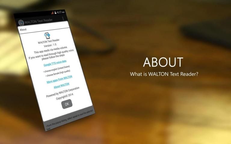 WALTON Text Reader adalah aplikasi yang dinamis pertama yang cepat, fleksibel, user friendly dan kompak untuk membaca teks yang nyaman. Ada banyak fasilitas, seperti start, pause, stop dll selama membaca teks dari browser, docs, PDF, editor teks dan sebagainya. Hal ini dapat dibaca beberapa kali jika pengguna ingin mendengar lebih banyak.