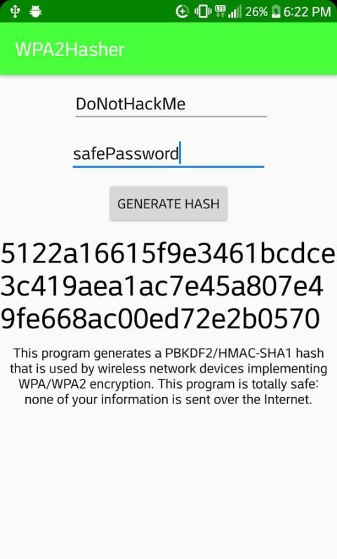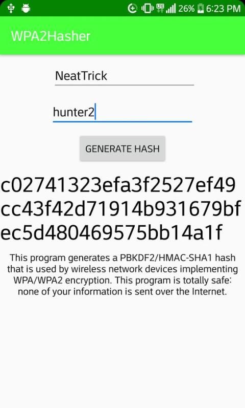 Aplikasi ini menghasilkan hash WPA / WPA2 PBKDF2 HMAC SHA1 yang digunakan oleh perangkat nirkabel untuk terhubung ke WiFi.
