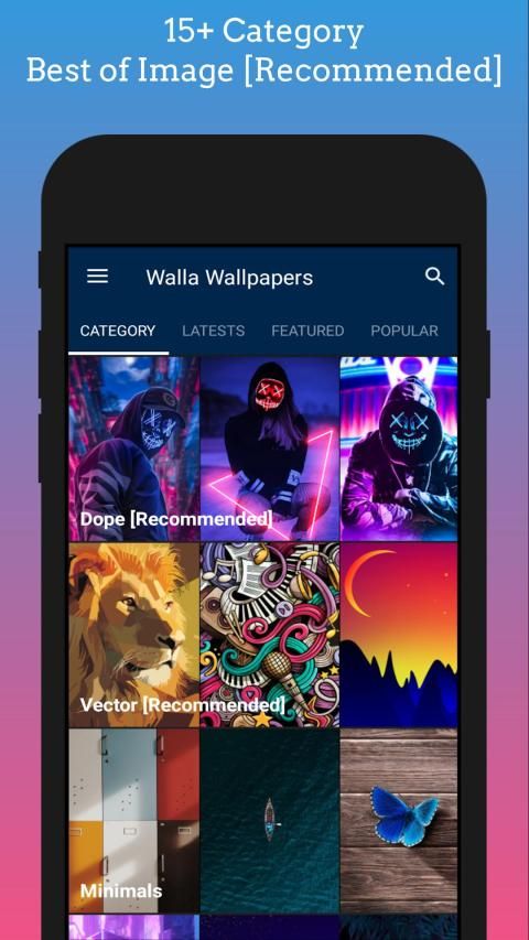 15 Category are sort by recent. contain with: Abstract, amoled, animal, art, beach, city, dark, dope, fantasy, flowers, minimal, mountain, nature, space, supercar, vector. age 7+ can use this app because not has adult photo.