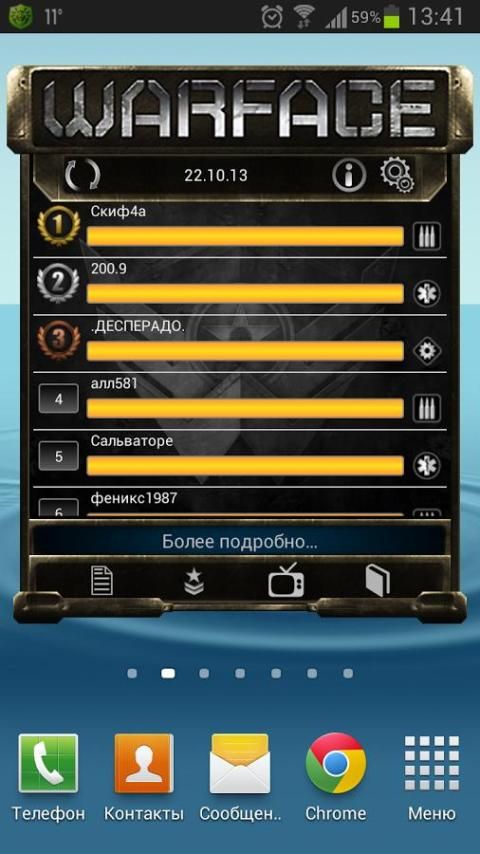 Ini adalah sebuah widget pada desktop yang menampilkan RSS feed berita, daftar video, penilaian untuk pemain dan klan dari situs Warface resmi. Aplikasi ini harus diinstal di bagian dalam kartu.