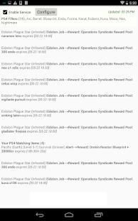 When the Service is enabled the app will periodically grab results from the Digital Extremes Warframe stats server for analysis. If a match is found the app can Notify you in several ways: ring an audible alarm, send Standard Android Notifications, or vibrate the device and flash the LEDs. This lets you know its time to play the game.. if you can do so within the expiration period given for each reward you will have a chance to win the desired resources. The Service on your device that grabs the data can be enabled or disabled from the main view in app.