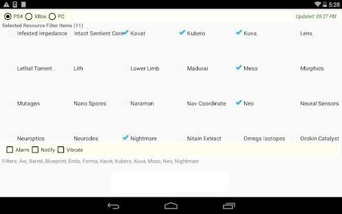 This app lets the Warframe player choose the game platform ( PS4 / XBOX1 / PC ) and select from over 80 resource items to be used as search filters from the current items rewarded in Events, Alerts, Invasions, and Plains of Eidolon reward pools (Bounties, Ghoul Purge, and Plague Star). These items change often in Warframe and you may lose out if you are not playing 7x24.